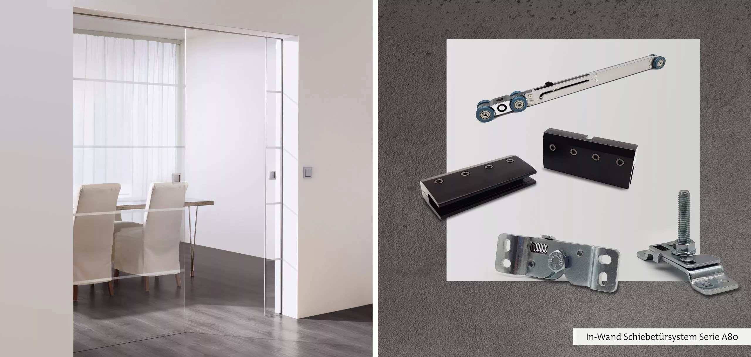 Alle Komponenten unseres Schiebetürsystems A80 sind speziell für die In-Wand-Montage ausgelegt und dementsprechend robust konstruiert.